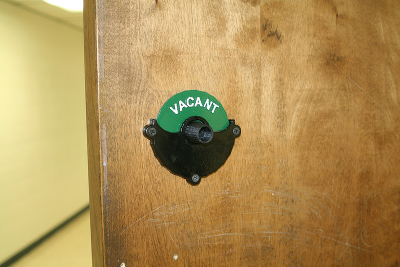 Bar will go through a hole in the door, then the covers go over the dials and are screwed to the door. That way, you can tell from inside the bathroom what it says outside.